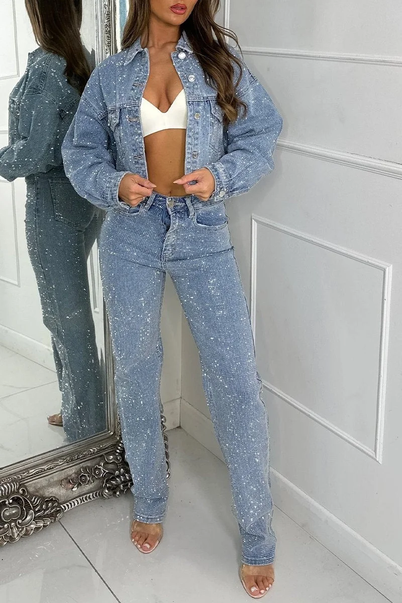 Women's Lapel Rhinestone Shiny Casual Denim Suit